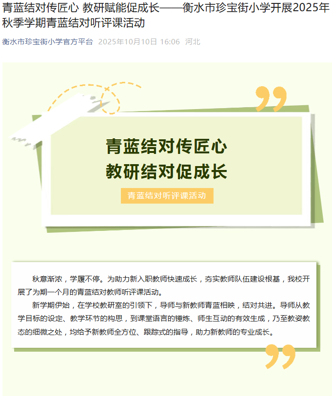 青蓝结对传匠心 教研赋能促成长——衡水市珍宝街小学开展2025年秋季学期青蓝结对听评课活动